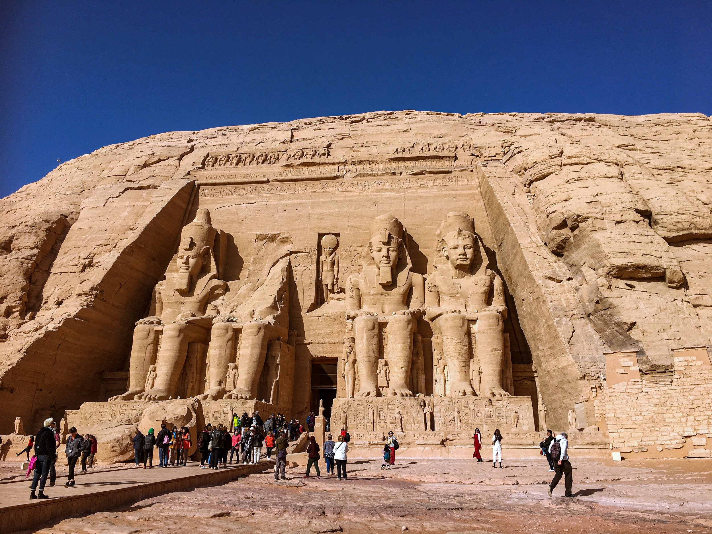 On our final day weβll visit one of the most famous and fascinating historical sites in Egypt: Abu Simbel Temple. Built during the reign of Pharaoh Ramesses II, it is a complex of two temples that were carved into a mountainside along the river. When the Aswan High Dam was being constructed, another massive engineering project took placeβthe piece-by-piece dismantling and relocating of the Abu Simbel Temple to its current location on much higher ground. Four colossal statues of Ramesses II, over 60 feet tall, guard the front entrance, and inside are incredibly preserved mural reliefs.